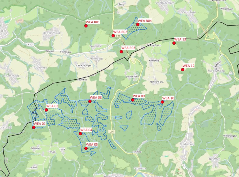 Aufgrund begrenzter personeller Kapazitäten beim Rhein-Sieg-Kreis, konzentriert sich die Genehmigungsbehörde zunächst auf Verfahren mit realistischen Genehmigungschancen. Daher wird aktuell ausschließlich das Verfahren für die acht WEA innerhalb der Entwurfsflächen bearbeitet.