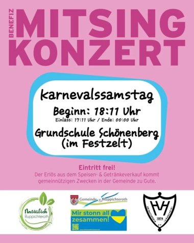 Zum 2. Mal heißt es am Karnevalssamstag, 14.02.2026, im Festzelt an der Grundschule in Schönenberg: Loss mer zesamme singe und fiere beim großen Benefiz Mitsing Konzert unter dem Dach des Heimatvereins Hänscheid.