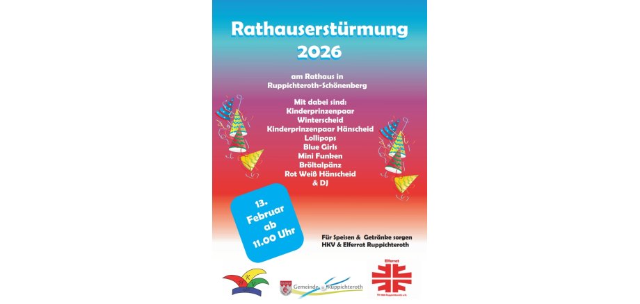 Wir laden alle Jecken herzlich zur Rathauserstürmung am 13.02.2026, ab 11 Uhr, ein!